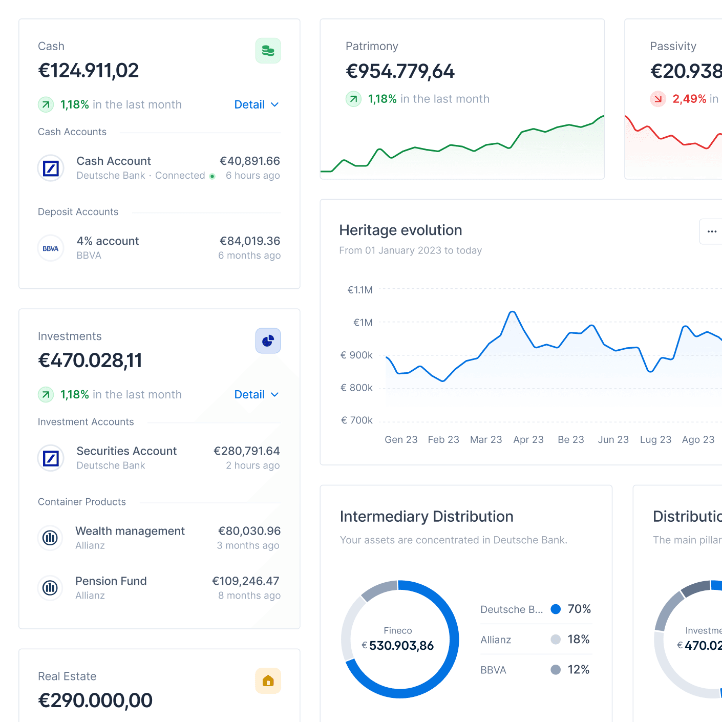 Checking accounts, ETFs, Mutual funds, Stocks, Bonds, Insurance policies, Wealth management, Pension funds, Real estate, and Crypto: everything in one place